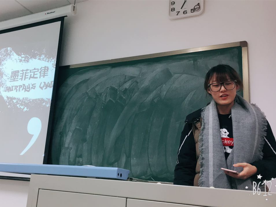 在座的同学们都深深感受到了该本图书的魅力,与阅读的快乐。其他班的讲解中不乏分享《追风筝的人》、《偷影子的人》、《霍乱时期的爱情》、《阿甘正传》、《穆斯林的葬礼》、《岛》等这样畅销文学小说作品的,也不乏解析《邓小平传》、《毛泽东传》等历史人物传记的,更少不了分享《社会契约林》、《中国历代政治得失》、《墨菲定律》等研究性学术作品的,还有同学则更乐于分享一些如《拖延心理学》、《天才在左 疯子在右》的更具有实用性、更现代的书籍。“这本书让我明白,我们做事要小心谨慎,不盲目乐观,做最坏打算,把错误和失败考虑在计划内,生活本来就很荒谬,荣耀只是短暂,卑微却是永恒。读书使我能懂得怎样更好地生活。”公共管理国际班,正在分享《墨菲定律》的张梦瑶同学感慨道。
