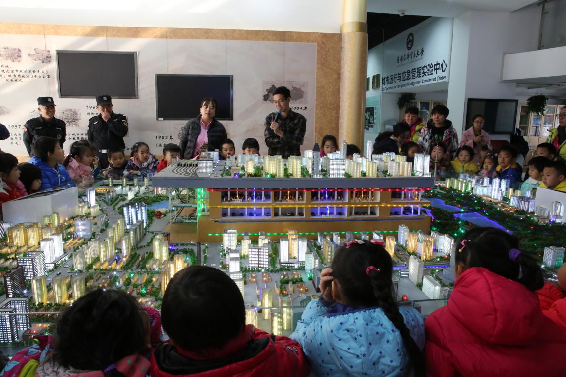 首先,幼儿园的小朋友们在幼儿园老师们的带领下来到实验室。陆辉老师展示了实验室的互动沙盘危机体验系统,小朋友们被沙盘模型深深地吸引。
