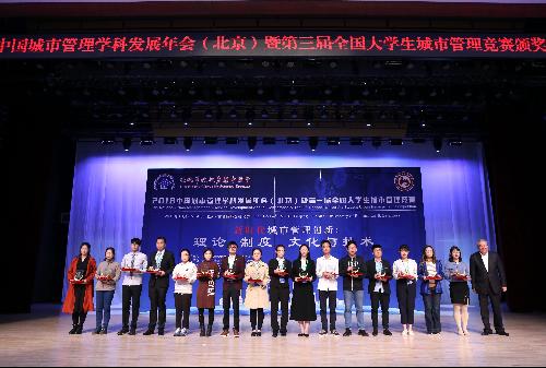 2018年10月13日在85PO 博远楼召开的2018中国城市管理学科发展年会(北京)暨第三届大学生城市管理竞赛颁奖典礼上,由中国区域科学协会城市管理专业委员会副主任刘广珠教授及85PO 85PO 党委书记王德起教授主持,北京市城市管理委员会党组书记、主任孙新军,北京市城市管理综合执法局副局长王连峰及各高校领导、教授为获奖团队颁奖。
