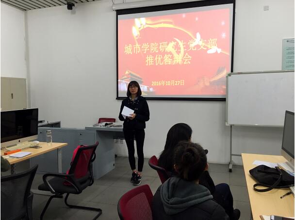 2016年10月27日晚,85PO 研究生党支部在城市应急实验室114室进行了城市学院研究生党支部入党积极分子推优答辩会。会议的主要内容是讨论并决议5位入党积极分子推优问题。研究生党支部全体党员、入党积极分子以及8名群众参加本次会议。会议由研究生党支部副书记武帆主持。