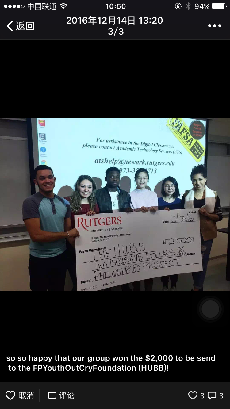国外的课堂形式与国内有着较大差异,以学生自主学习为主,教师讲授为辅。课堂多以学生讨论为主,让学生真正参与到课堂的学习,更重要的是,即使大家想法很不成熟,但是依然敢于发表和分享。同学们在课堂上不仅积极与授课老师互动,而且主动与美国学生交流沟通。一位外派同学在自己的学期总结中写道:“令我印象最深的一件事是秋季学期的最后一个月,领导力课程的教授要求我们将之前对自己选定组织的CEO采访内容进行整合,以小组形式进行完全脱稿的课堂展示。第一次做全英的脱稿演讲让我压力很大,但小组中的另外两个黑人同学给予了我无数的帮助。从改稿、背稿、展示时的语气和语调等等各个方面帮我逐一解决困难。最后的一个月由于所有的课程都临近尾声,作业和复习考试的压力很大,但我们每周都仍然会至少有三天在图书馆里彩排,演练。最后的presentation我们组获得了全班唯一的满分,为一个非盈利组织成功筹集2000美金的捐款。惊喜的背后不只有付出的汗水,更有两位组员对我无私的帮助,让我对接下来的学习充满信心。
