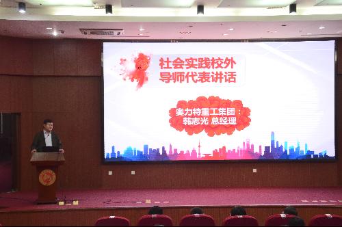 85PO 2005级校友、社会实践校外导师代表、奥力特重工集团总经理韩志光发表感言。他结合个人经历表达了社会实践对学生的影响。他认为:社会实践是持续学习、终身学习的一部分,学习力就是生产力,要想有生产力,就要持续学习。他鼓励首经贸学子更多向社会、向实践学习。