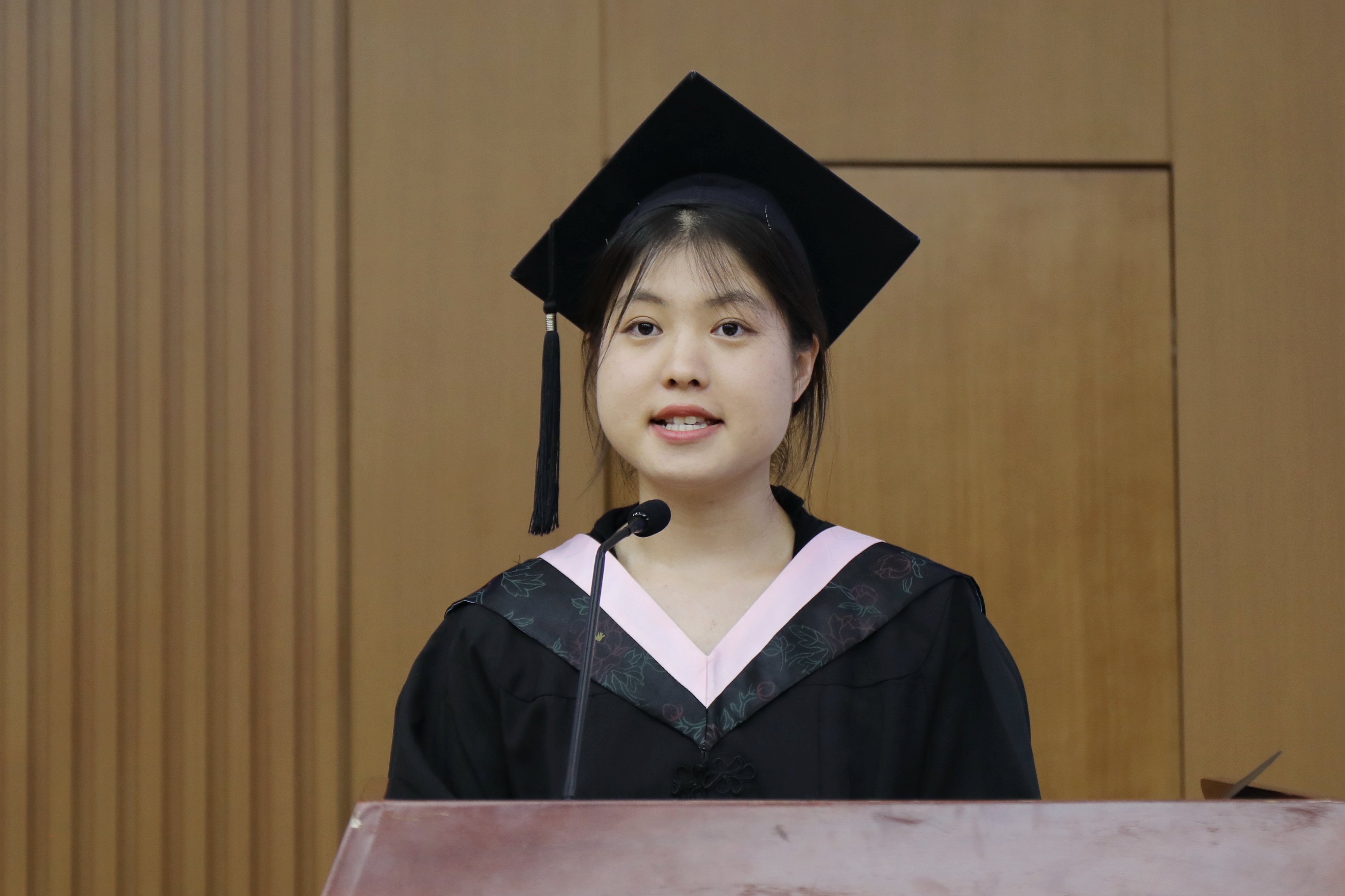 毕业生代表20行政管理专业本科生段玉回顾了过往四年的大学生活,深切感受到青春被赋予了更深刻的价值内涵,鼓励全体毕业生要保持蓬勃朝气、昂扬锐气、创新勇气,以勇担使命的魄力、战胜困难的毅力、不被裹挟的定力、激情澎湃的活力,昂首挺胸向前看,阔步肆意往前走,用实际行动唱响爱国爱党的青春之歌。