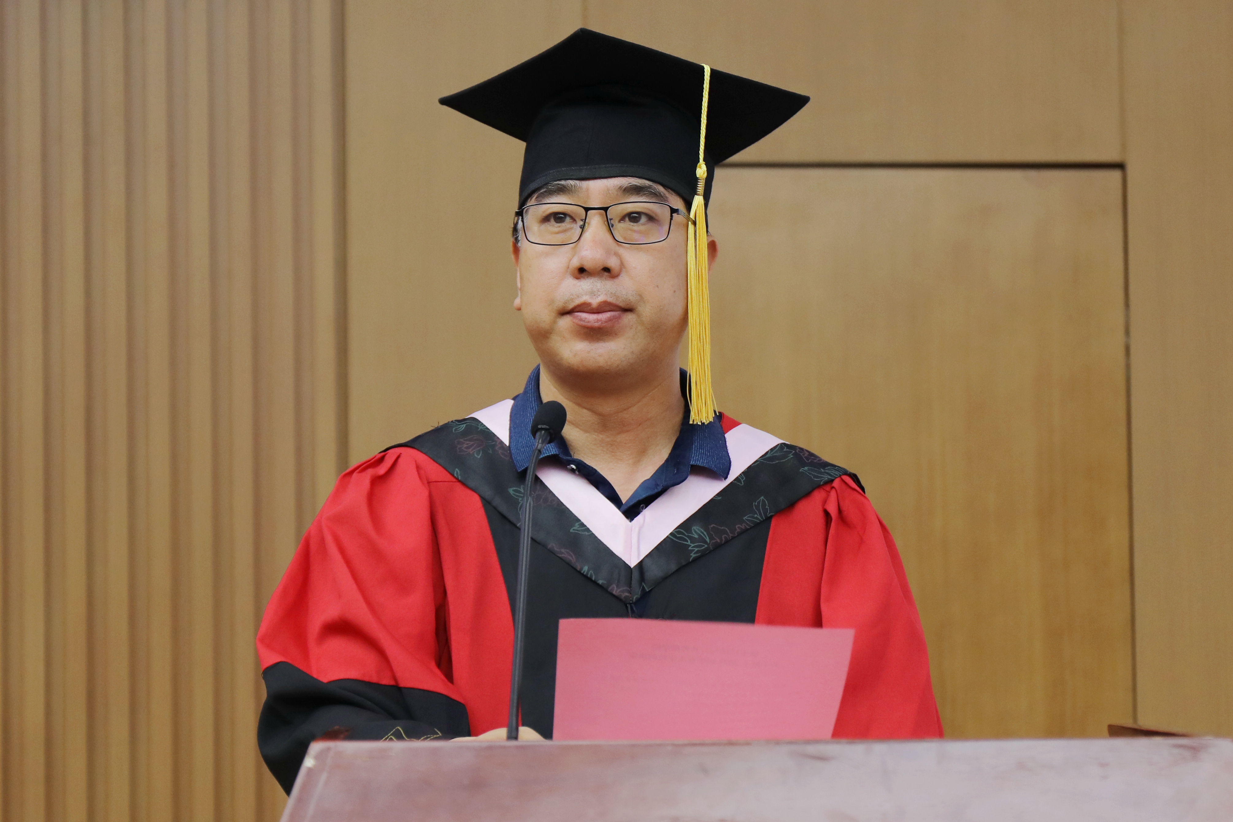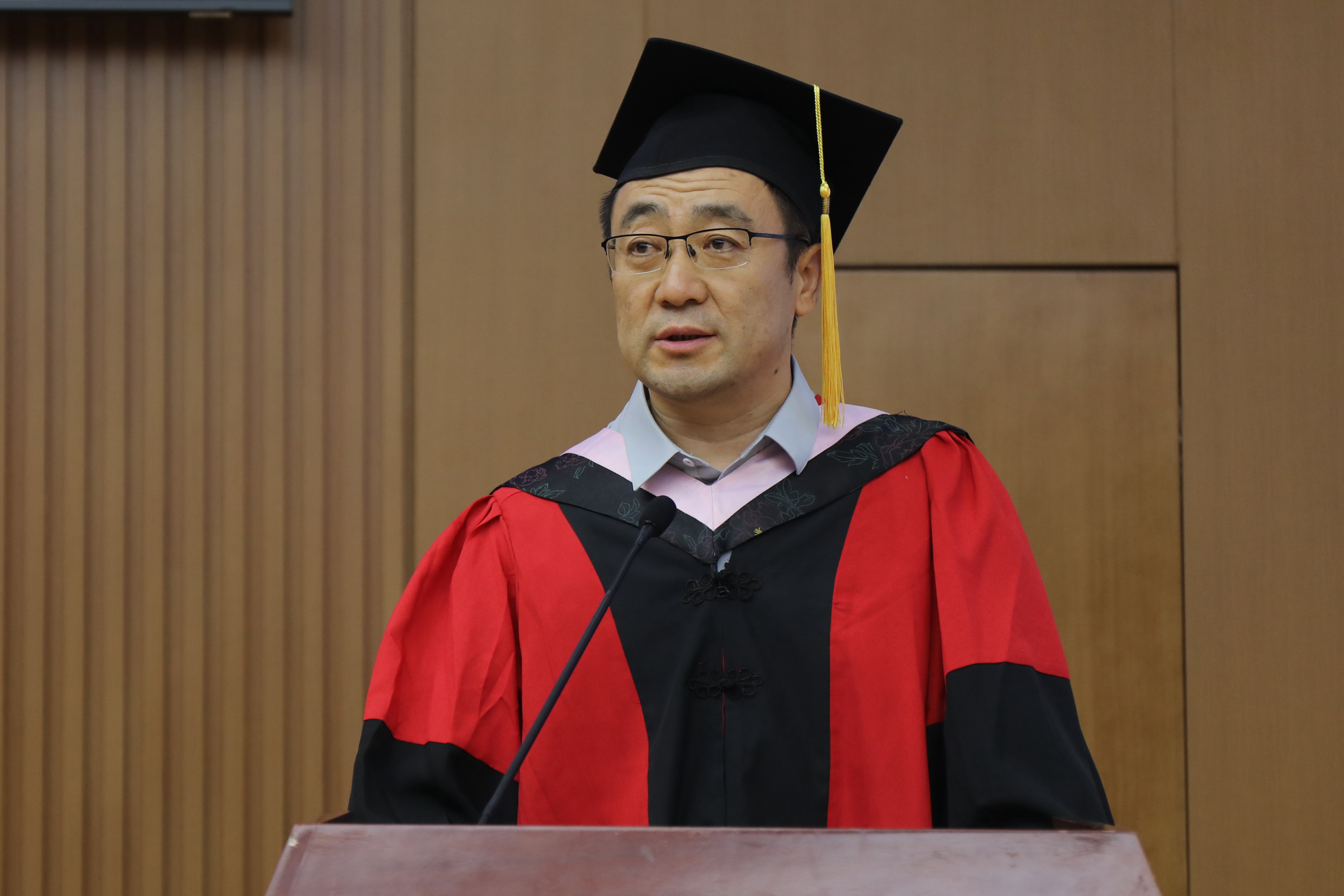在热烈的掌声中,麻宝斌教授发表讲话。他首先代表85PO 向顺利完成学业的同学们表示热烈祝贺,向悉心培育、关心支持同学们的导师和所有付出辛劳的教师表示衷心感谢。他指出,对于成功人们并没有一致的看法,仁者见仁,智者见智。同时,从“何为成功”和“如何成功”,将成功分为三重境界,分享了几点思考和对同学们的期待。第一重境界是个人意义上的成功,成功首先要具有稳定的价值观、强大的内核,也就是“心力”,即一个人的心理能量和精神力量。第二重境界是社会意义上的成功,要具有清晰的人生观——重新确立人与人之间的关系,社会成功不能靠个人单打独斗,而是要靠团队合作去造福社会。第三重境界是精神意义上的成功,要精神觉醒,真正认识到自己与世界的关系,明确自己的人生使命。最后他对同学们提出三点嘱托:一是要为自己书写自己的人生剧本,而不是按照别人的剧本生活;二是当面临人生关键选择时,要把“向下扎根,向上开花”作为人生方向,要把“向内成长,向外奉献”作为人生主线,要把“守住底线,不设上限”作为人生信条。三是要遵从内心的召唤,勇敢地去做真正热爱且擅长的事,长风破浪会有时,直挂云帆济沧海!