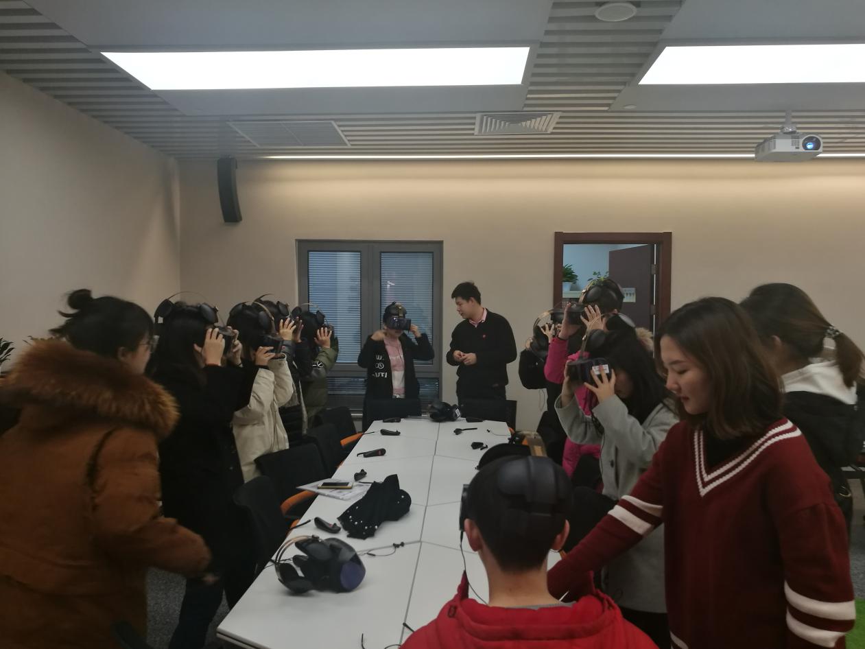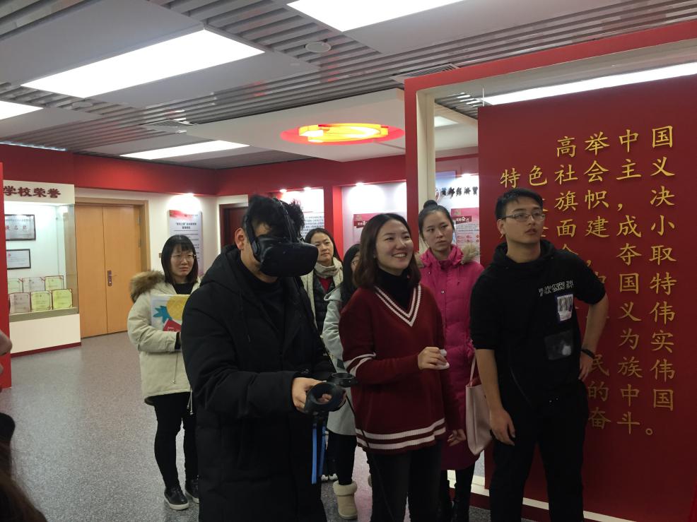 在VR体验区,在讲解员的教学下不少同学积极通过VR设备体验了战争环境实景模拟,感受战争的激烈与残酷。通过科技的动态模拟技术与真实的共产党的发展经历相结合,在场的所有同学切身体会到共产党先辈来取得的一场场来之不易的胜利。