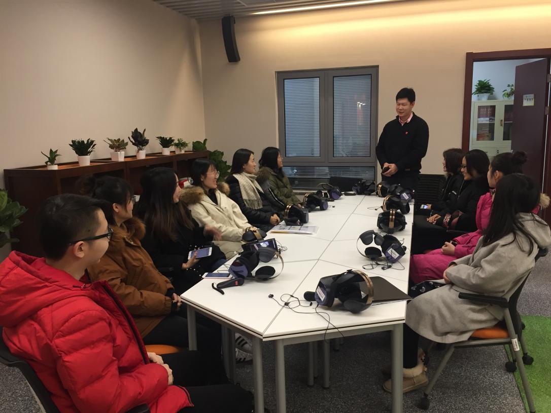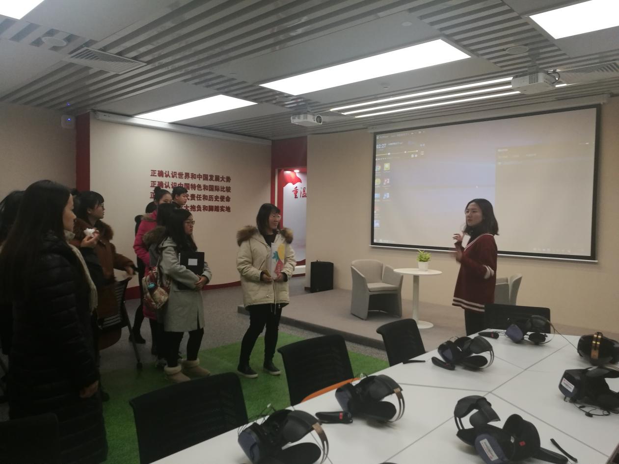讲解员首先介绍了大厅的基础桌椅设备。在张东倪的讲解下全体成员了解到党员之家面积180平米,分为三个功能区,分别是党建发展展示区、VR体验区和活动交流区。在对基础设备进行讲解之后张东倪带领大家来到VR模拟战争场景的体验区进行了体验及参观。