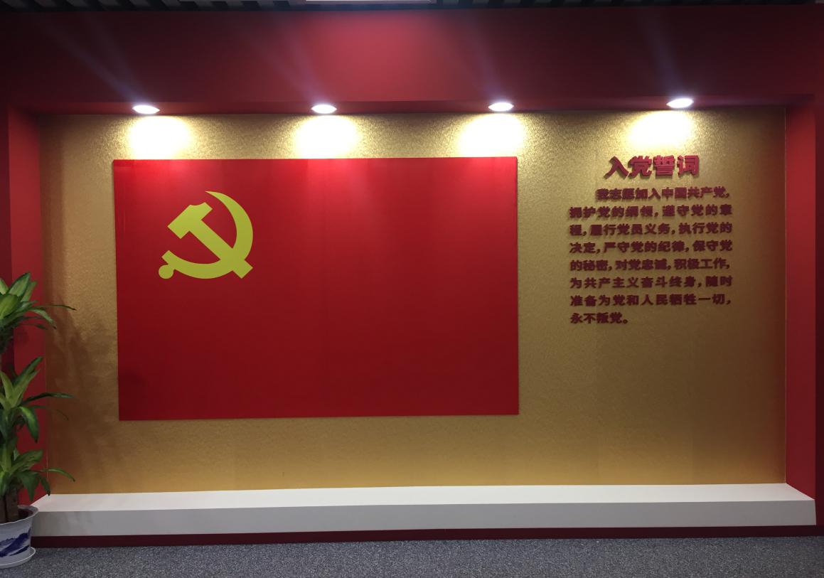 在体验过VR动态模拟设备之后,张东倪带领全体成员走到党建发展展示区。本展区展出了学校党建的历史沿革和取得的建设成就。大厅上方是党徽、西侧墙面是党旗和入党誓词,党旗两侧是习近平总书记“不忘初心、牢记使命”和“志存高远脚踏实地”的寄语。当同学们头顶党徽,面对党旗时,强烈的视觉和感官冲击给大家一种庄严的仪式感,让即将成为预备党员和刚刚转正的党员都对自己的党员身份有了更强的自豪感。