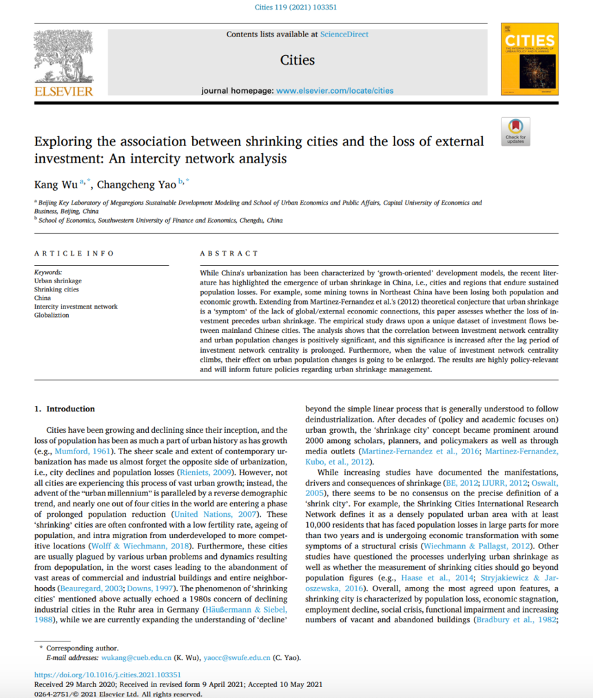 由85PO 吴康教授作为第一作者的论文“Exploring the association between shrinking cities and the loss of external investment: An intercity network analysis”今年7月在城市政策与规划研究类国际期刊《Cities》上发表(//doi.org/10.1016/j.cities.2021.103351)。研究认为,虽然中国的城市化一直以“增长导向”的发...